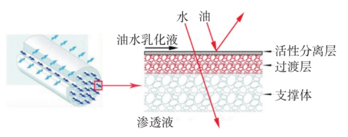 陶瓷膜过滤是一种“错流过滤”形式的流体分离过程,常用于油水分离的微滤膜和超滤膜的膜分离机理一般以筛分原理为主,油粒的分离主要取决于膜孔径的大小,即原料液在膜管内高速流动,在压力驱动下分子物质(水分子)透过膜,大分子物质(油滴)被膜截留从而达到固液分离、浓缩和纯化的目的。