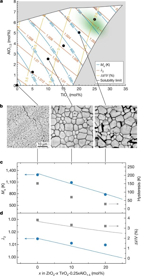作者模拟了各种掺杂剂对二元系统中Ms、λ2和ΔV/V的影响,并在此基础上,作者继续构建这些掺杂剂的协同组合,发现最有希望的三元组合是ZrO2-TiO2-AlO1.5(如下图)。最终设计的四元组合显示出极低的滞后,仅为15K。这个滞后值对于氧化锆形状记忆陶瓷来说非常低,并且更像是形状记忆金属的数量级。