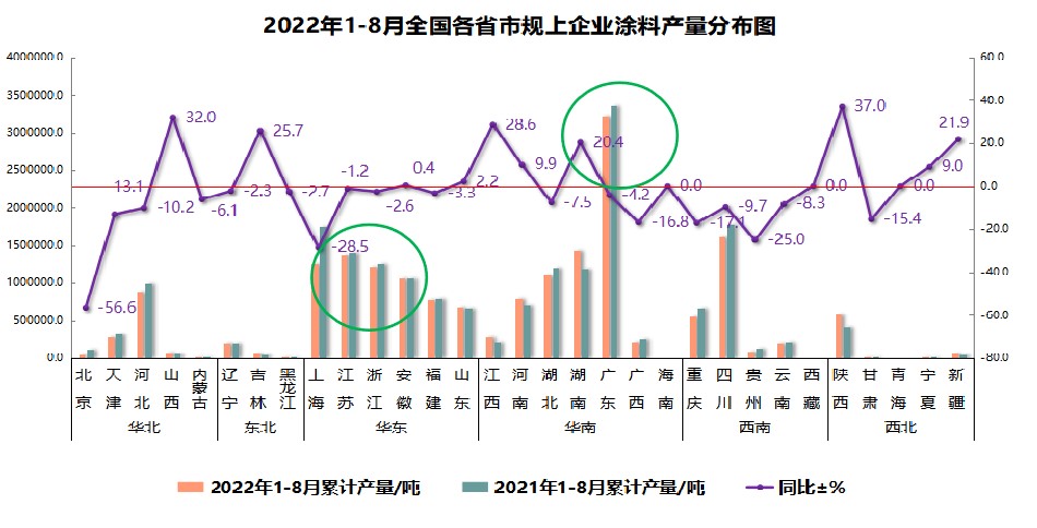 报告显示,2022年1-8月,我国涂料行业全行业总产量约2259.7万吨,同比下降4.3%;主营业务收入总额约2897.6亿元,同比下降2.0%;利润总额约141.1亿元,同比下降26.0%。具体到各省来看,1-8月大多数省份涂料产量同比都有所下降,广东、上海下降幅度最大,深受“口罩”问题反复的影响。
