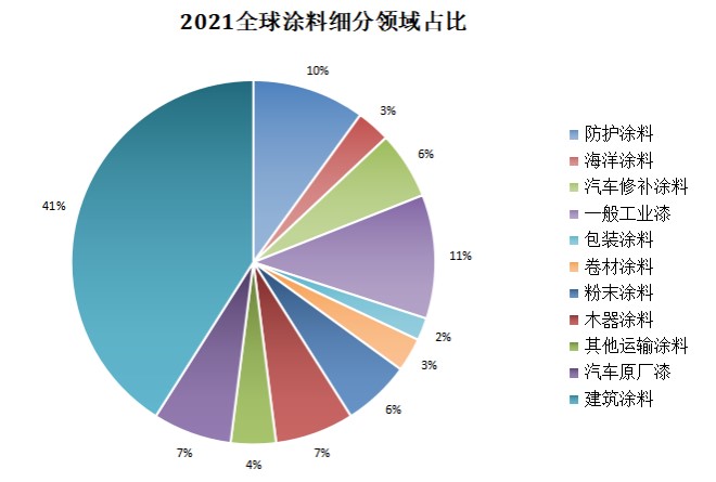 从2021年中国与全球涂料行业细分对比来看,中国涂料行业细分领域占比与全球涂料细分领域占比并无太大差异,建筑涂料占比最大,其次是防护涂料。不同的是,中国建筑涂料占比52%,比全球涂料占比高出10个百分点,但在工业涂料、木器涂料、汽车原厂漆、运输涂料等领域,中国占比普遍都比全球要小,说明这些领域还有很大发展潜力。