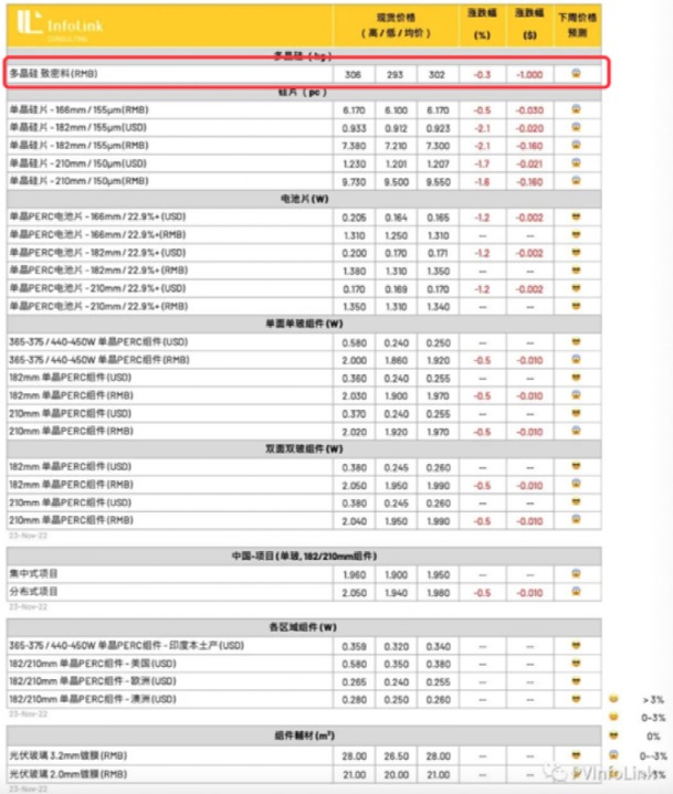 据PV infolink在11月23日最新公布的报价显示,本周多晶硅价格出现下降,均价由303元/kg下降至302元/kg,降幅0.3%。这也是多晶硅价格年内首次出现下降。