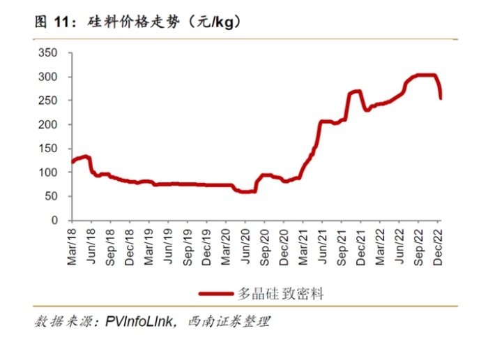 中国粉体网讯 硅料价格12月初迎来期盼已久的拐点,PVinfolink数据显示,目前多晶硅致密料均价跌至240元/kg,最低价近185元/kg,距离2022年内高点330元/kg跌超40%。尽管这一价格仍高于2022年初的水平,但硅料降价的口子一旦打开,其降价的趋势便已经确定。