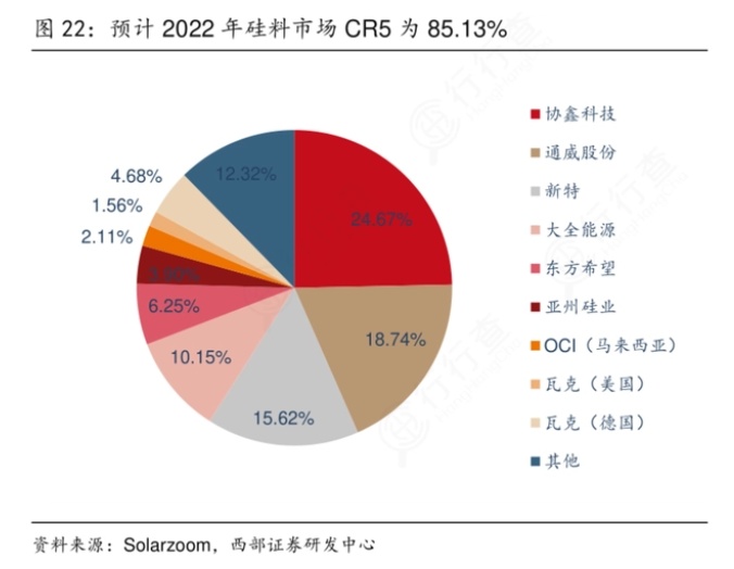 作为光伏产业链中最紧缺的环节,硅料牵一发而动全身。根据Solarzoom数据,2021年大全能源、通威股份、新特能源、保利协鑫和东方希望共5家国内企业占据了国内85.23%的有效产能。