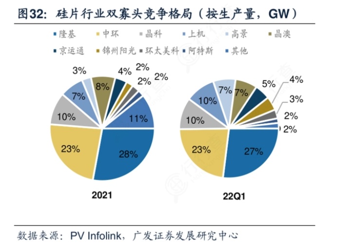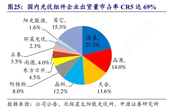 从组件行业的竞争格局来看,2021年,国内光伏组件企业出货量市占率CR5达69%,主要玩家中隆基以38.5GW的出货量排名第一,市占率高达21.2%,晶澳科技、天合光能、晶科能源等次之。