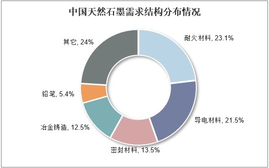 从国内市场需求结构来看,天然石墨在冶金铸造、耐火材料的需求占比有较为明显的减少,密封材料、负极材料导电材料等领域占比持续提升。具体来看,我国天然石墨需求占比前三分别为耐火材料、导电材料和密封材料,占比分别为23.1%、21.5%和13.5%。