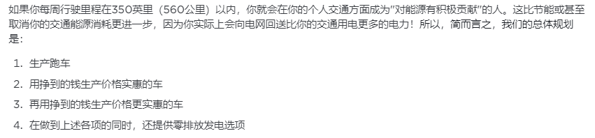 第一篇章的主要内容便是推广电动汽车并实现盈利。篇章中主要提出以下内容: