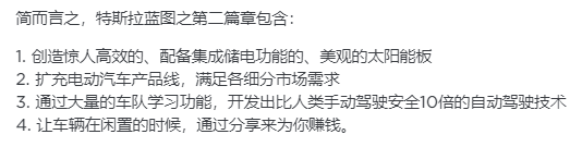 第二篇章的主要内容是推广太阳能、开发自动驾驶、扩充产品线等。