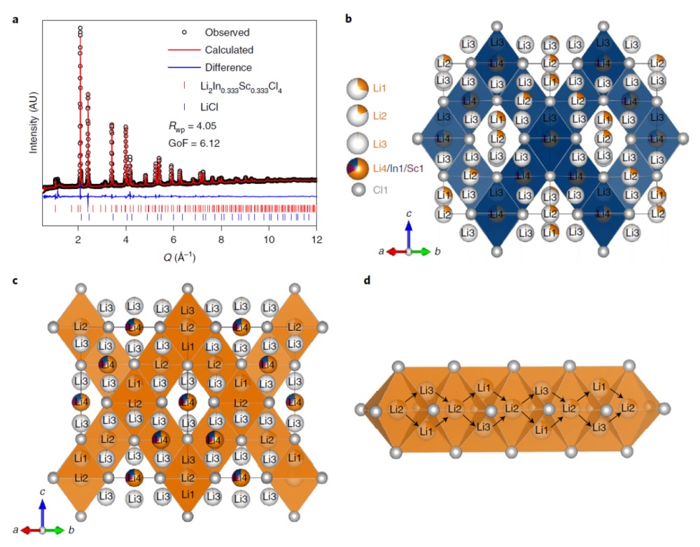 Li2In1/3Sc1/3Cl4的结构和可能的锂离子扩散途径(来源:Lailong Zhou,et al,High areal capacity,long cycle life 4 V ceramic all-solid-state Li-ion batteries enabled by chloride solid electrolyte)