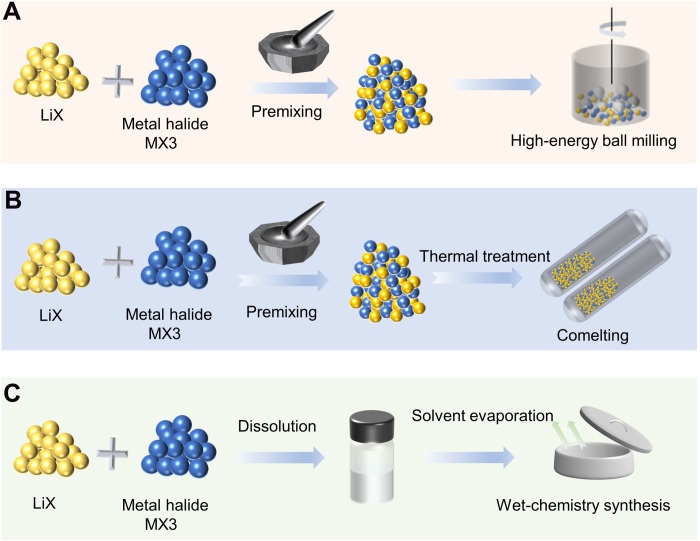 卤化物固态电解质的合成方法。(A)高能球磨;(B)共熔法;(C)湿化学合成。(来源:Changhong Wang,et al,Prospects of halide-based all-solid-state batteries:From material design to practical application)