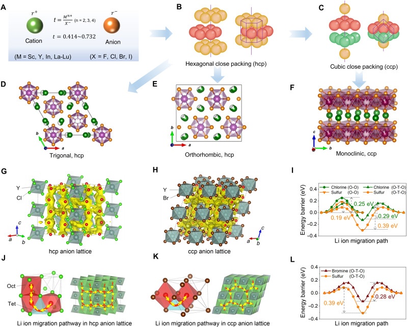 卤化物固态电解质的结晶学和离子传输动力学。(A)正负离子晶体半径比;(B)卤素离子的六方密排结构;(C)卤素离子的立方密排结构;(D)含hcp阴离子排列的三角晶体结构(Pm1);(E)含hcp阴离子排列的正交晶体结构(Pnma);(F)含ccp阴离子排列的单斜晶体结构(C2/m);(G)Li3YCl6(类似hcp的阴离子晶格)和(H)Li3YBr6(类似cp的阴离子晶格)的晶体结构,黄色标记为AIMD模拟得到的Li+概率密度;(I)在hcp亚晶格中单个Li+迁移的能量分布图;(J)Li3YCl6中Li+的迁移路径;(K)Li3YBr6中Li+的迁移路径;(L)ccp亚晶格中单个Li+迁移的能量分布图。(来源:Changhong Wang,et al,Prospects of halide-based all-solid-state batteries:From material design to practical application)