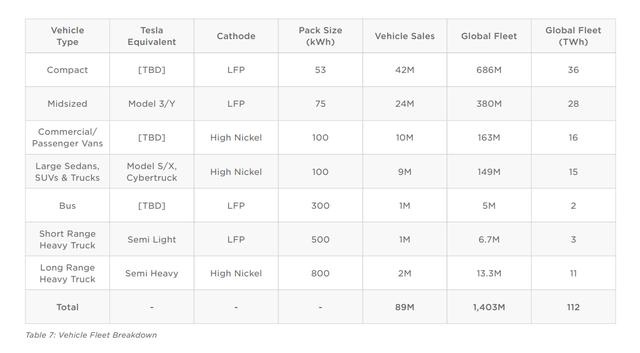 具体来说,紧凑型电动汽车(特斯拉车型未定)将配备53kWh磷酸铁锂电池,目标销量4200万辆。中型汽车(如特斯拉Model 3/Y)将配备75kWh磷酸铁锂电池,目标销量2400万辆。大型三厢车、SUV和货车(如特斯拉Model S/X及Cybertruck电动皮卡)将配备100kWh高镍电池,目标销量900万辆。长续航重卡(如特斯拉Semi电动卡车)将配备800kWh高镍电池,目标销量200万辆。