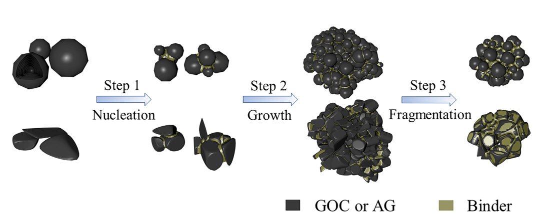 针对这一问题,北京化工大学宋怀河教授课题组在《新型炭材料》(New Carbon Materials,2022,37(2),402-411)上发表研究论文“A wet granulation method to prepare graphite particles with a high tap density for high volumetric energy density lithium-ion storage”。该文报道了一种通过湿法制粒制备高振实密度石墨颗粒的简单方法。通过高剪切湿法制粒技术将石墨化洋葱碳(GOC)和人造超细石墨(AG)致密成球型大颗粒(WG-GOC、WG-AG),见图1。所制备石墨颗粒具有较高的球型度和致密度,能有效地提高材料振实密度,并获得了高体积比容量。