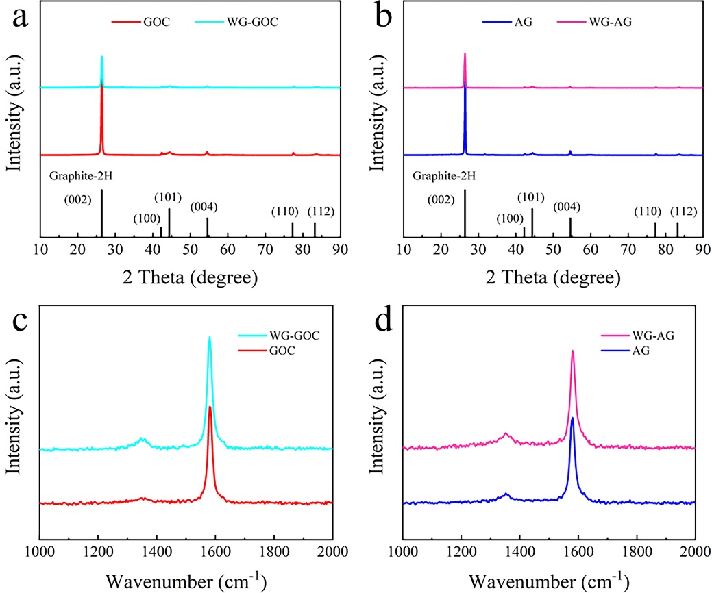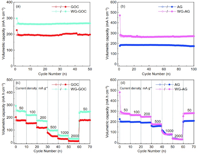 电化学结果表明(图3),在50mAg-1的电流密度下,造粒后的WG-GOC和WG-AG相比于各自的石墨原料,体积比容量分别增加了35%和55%。更让人惊讶的结果是,在1000mAg-1和2000mAg-1的大电流密度下,相比GOC,WG-GOC的体积比容量分别提升了94.4%和165.7%。此外,得益于高剪切湿造粒加工时间短、造粒效率高等优点,该研究提供了一种制备高振实密度石墨负极的简便方法,具有良好的工业化前景。