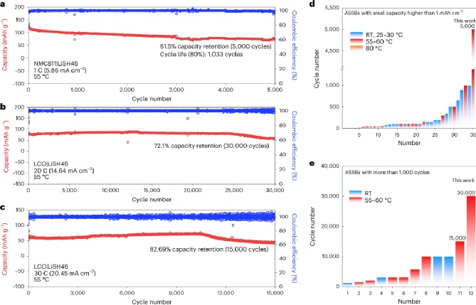 硬碳稳定化锂硅合金负极组装硫化物全固态电池,可以实现优异的长循环性能。匹配5.86mAhcm-2的NMC811正极,可以在5.86mAcm-2(1C)下循环,首周可逆容量达3.6mAhcm-2,循环寿命为1033圈,在循环3000(5000)圈后容量保持70%(61.5%)。匹配0.73mAhcm-2的LCO正极,可以在14.64mAcm-2(20C)和20.45mAcm-2(30C)下循环30000周和15000周,容量分别保持72.1%和80%。