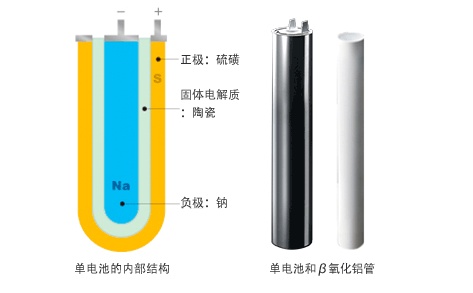 据NGK的介绍,钠硫电池的单电池为圆筒状的完全密封结构。是由作为活性物质的钠(Na)和硫磺(S)以及精细陶瓷的电解质构成。Na为负极活性物质,S为正极活性物质。在300℃的单节电池中,Na和S是液体,电解质是固体的状态。固体电解质的陶瓷材料使用了Na离子导电性的β氧化铝。