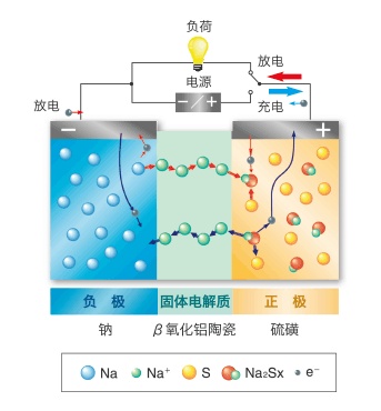 放电时,负极的钠释放出电子成为钠离子,通过固体电解质向正极移动。正极的硫和从外部回路的电子Na离子发生化学反应,变化为多硫化钠(Na2Sx)。负极的Na被消耗减少。从负极向外部回路被释放出的向正极移动的电子流变成为电力。