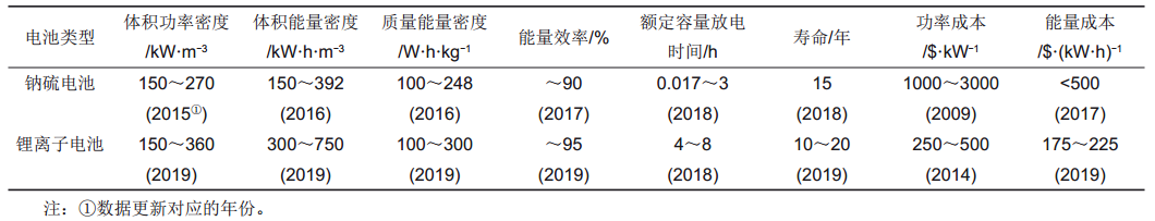 钠硫电池与锂离子电池应用于储能的主要技术参数
