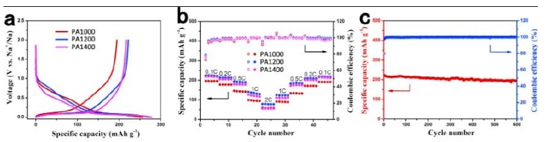 如图2所示,有研究者在1200℃下一步热解无烟煤,制备了无烟煤基炭材料,在0.03A/g电流密度下具有222mAh/g的可逆比容量和稳定的储钠循环性能,并已将其应用于低速电动车,实现规模化制备。
