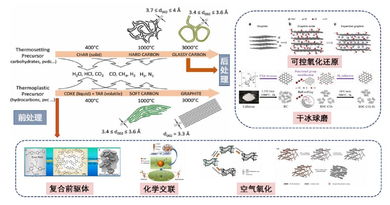 对于碳材料结构调控方法根据作用阶段可以分为前处理、后处理过程(如图3所示),根据处理种类可以分为热处理、物理/化学活化法以及机械化学方法等常用方法。后处理过程主要对目标碳材料进行改性处理直接用于钠离子电池负极,在调控微晶结构的同时可能引入诸多不可逆位点。前处理过程相对于后处理来说,主要针对前驱体进行改性处理,不需要严苛的处理条件,是重要的温和改性方式。前处理主要是影响材料在炭化时的结构演变过程,以微晶结构的变化为主要作用,同时减少部分不可逆位点的分布。