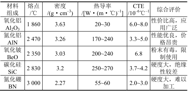 相比之下,氮化铝陶瓷的各项性能优异,尤其是高热导率的特点,其理论热导率可达320W/(m·K),其商用产品热导率一般为180W/(m·K)~260W/(m·K),使其能够用于高功率、高引线和大尺寸芯片封装基板材料。