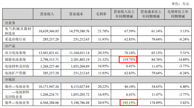储能电池系统营业收入增速超过动力电池业务,达到279.85亿元,同比增长119.73%。根据行业数据,报告期内,全球储能电池出货量为87.0GWh,同比增长122.0%。