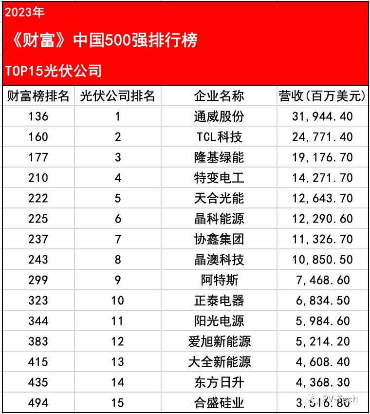 中国粉体网讯 日前,2023年《财富》中国500强排行榜发布。光伏企业势头强劲,多达15家!
