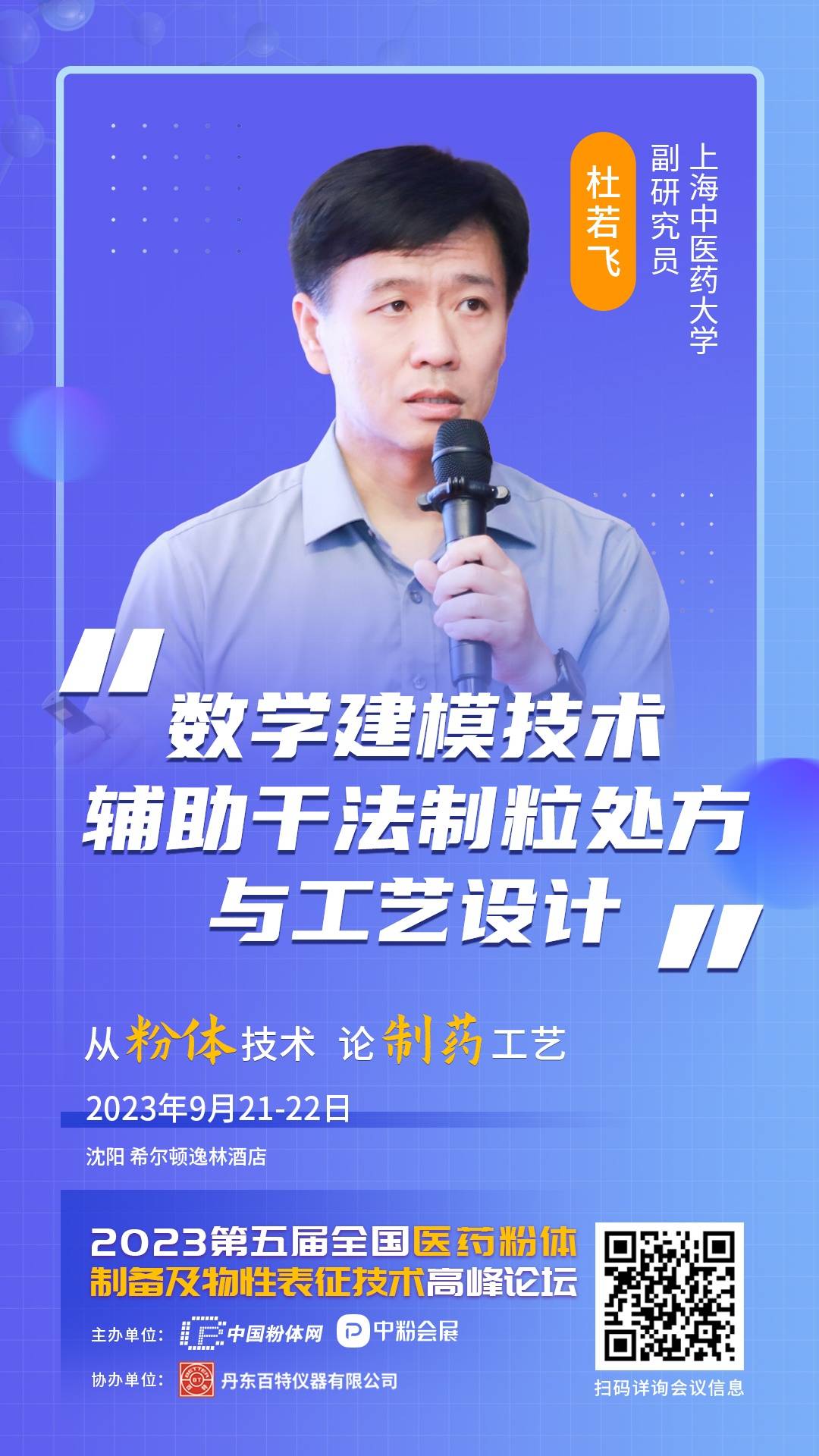 2023年9月21-22日,中国粉体网以“从粉体技术,论制药工艺”为主题,将在辽宁沈阳希尔顿逸林酒店举办“第五届全国医药粉体制备及物性表征技术高峰论坛”,本次会议特别邀请来自上海中医药大学中药现代制剂技术教育部工程研究中心的杜若飞副研究员作《数学建模技术辅助干法制粒处方与工艺设计》的专题讲解,为解决口服干法制粒处方与工艺开发过程中反复试错造成的研发效率低下问题,针对过度依赖研究人员经验引发起的制剂质量均一性、一致性、稳定性问题提供了可行的技术方法。