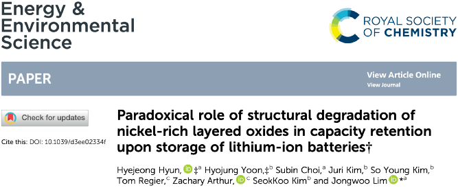 Paradoxical role of structural degradation of nickel-rich layered oxides in capacity retention upon storage of lithium-ion batteries.H. Hyun, H. Yoon,S. Choi, J. Kim, S. Y. Kim, T. Regier, Z. Arthur, S. Kim and J. Lim, Energy Environ. Sci., 2023, DOI:10.1039/D3EE02334F.