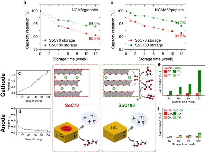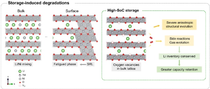 研究结果全面展示了在存储过程中CAM的结构降解以及其对容量保持的逆向影响。中等SoC的存储导致CAM的相对轻微降解,但由于全电池中严重的锂库存损失,容量快速衰减。相反,高SoC的存储抑制了容量衰减,但以CAM严重降解为代价,导致CO2的生成。尽管在早期阶段副反应可能抑制了表观容量衰减,但CAM的降解和相关的副反应会消耗电解液,增加了电池失效的潜在风险。因此,抑制CAM中氧释放、减少中高SoC存储期间的不可逆锂库存损失和随后的容量衰减,以及提高阳极处的还原稳定性,将成为减轻存储引起衰减的关键策略。本文的结构分析为减少高SoC存储期间气体生成、优化存储协议提供了宝贵的见解。