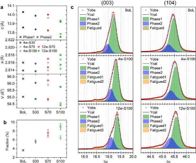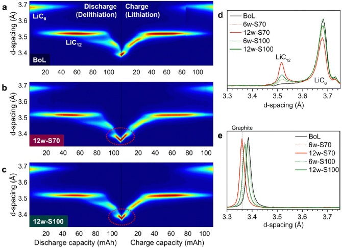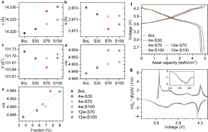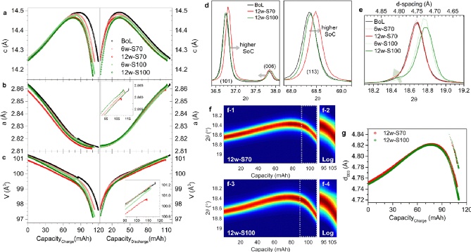 通过对衰减的NCM6/石墨电池进行分析,利用阳极(图2)和阴极(图3a–c)的原位X射线衍射图来分析活性材料的结构变化。图中的“12w-S100”代表在SoC100下储存了12周的电池。随着储存时间的增加,阳极中的锂含量降低(图2d),而阴极脱出的锂未能充分地重新插入到阳极中,这可能是由于电池内的CAM降解或可循环锂的损失。储存时间的增加还导致了阳极d-间距的峰值位置下移(图2e),这表明锂浓度在GIC中减少。SoC70电池的阳极在充电和放电终点显示出较低的锂含量,表明储存后整个电池内的锂库存损失。与初始状态相比,衰减NCM6的结构演化显示出:(1)晶格参数c(即层间距)的最大值降低,(2)放电结束时稍高的SoC,以及(3)在SoC100电池中充电终点处c的收缩。另外,衰减电池中NCM6的晶格参数a略微减小(图3b),单位胞体积V也有所下降(图3c),这在放电终点(EOD)时表现出来。XRD图中的相应峰值偏移(图3d)表明阴极的SoC较高。在12w-S70的阴极中,SoC的增加是由于阳极电位的偏移造成的。因为石墨阳极不能进一步去锂化,所以在SoC70存储的电池中,NCM6阴极无法在EOD处充分锂化。在SoC100条件下,(003)峰向更高角度移动(图3e、f),这表明在充电终点处c的显著收缩。随着SoC100存储时间的增加,c的收缩变得更加严重。此外,在高SoC区域出现了一个被称为疲劳相的次要相(图3e,f)。疲劳相具有有限的容量。图中(003)峰分解为两个峰(图3g),分别对应于活性相和疲劳相。随着储存时间增加,12w-S100电池中的疲劳相比12w-S70更为明显。疲劳相的结构演化与前者相似。