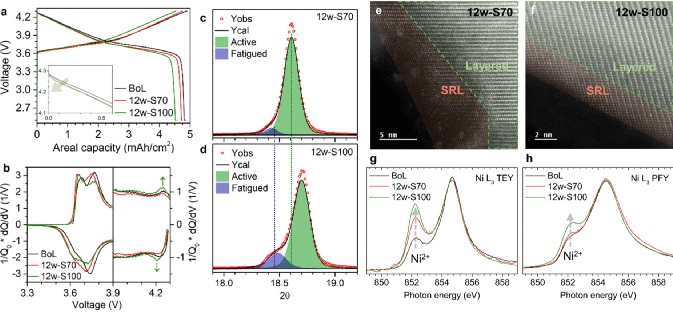 通过半电池测试揭示了CAM的结构衰减。实验过程中,从衰减的全电池中取出NCM6阴极与锂阳极重新组装成半电池,然后在进行两次循环后进行测量。尽管在NCM6半电池中进行了两次循环,SoC100在全电池中的电压曲线变化仍然在半电池中体现出来(图4a)。12w-S100的dQ/dV曲线(图4b)上的相应峰比初始状态(BoL)更加显著,这表明NCM6阴极存在永久性的结构变化。即使经过12周的储存,SoC70的全电容量保持率(90.6%)低于SoC100(94.0%),但NCM6阴极的情况却相反(图4a)。因此,SoC70的全电容量衰减主要是由于锂库存的流失,而不是不可逆的CAM降解。在电池中有足够的循环锂的情况下容量可以恢复。通过原位同步X射线衍射(SXRD)图,可以观察到经过高温储存后NCM6阴极的持续结构衰减(图4c、d)。通过DF-STEM图确认了12w-S70(图4e)和12w-S100(图4f)阴极表面存在表面重构层(SRL)。此外,通过对Ni K边XANES分析,可以得知Ni的整体平均氧化态。结果显示,12w-S100中活性相中的Ni氧化态更高。