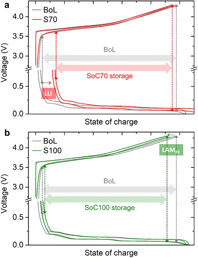 Scheme 1总结了通过原位X射线衍射和衰减NCM6阴极的表征揭示的NCM6/石墨电池在储存条件下引起的衰减机制。虽然在SoC70条件下的储存不会严重降解CAM,但是在储存过程中锂库存的流失将阳极电位曲线向右移(Scheme 1a)。这种阳极电位移动阻止了低SoC区域的阴极利用,导致不可逆的容量衰减。这种容量衰减主要源于锂库存的流失。另一方面,在SoC100条件下的储存导致的容量衰减主要是由于CAM的永久性结构衰减引起的。尽管SoC100中CAM的降解比SoC70更严重,但相关的氧化副反应抑制了阳极电位移动(即锂库存的流失)以及随后的容量衰减。因此,在SoC100条件下的容量损失是由于阴极结构的衰减,而不是在储存期间锂库存的流失。