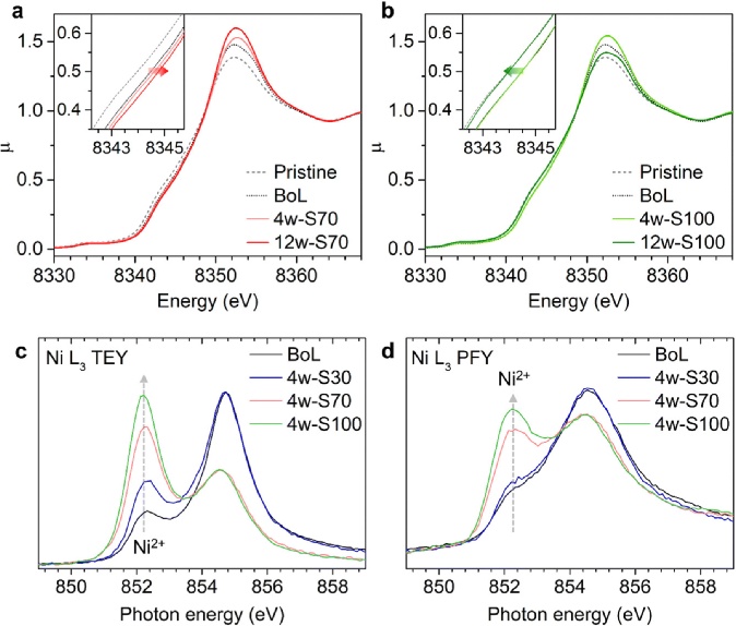 研究了经过12周存储的SoC70和SoC100条件下的放电状态中Ni的氧化态变化(图7a、b)。SoC70阴极中的Li缺陷导致Ni的氧化态更高(图7a)。然而,SoC100的阴极Ni氧化态显著降低。通过sXAS研究了由于SRL存在而引起的表面氧化态变化(图7c、d)。SRL的形成导致表面区域附近Ni的氧化态明显降低。存储了4周的NCMA8相较于经过12周存储的NCM6,在表面Ni的氧化态下降方面表现更为明显(图4g、h),这突显了高镍NCM(A)的表面不稳定性。
