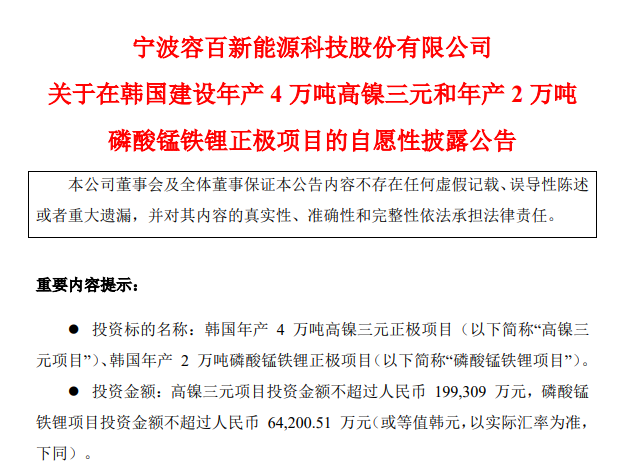 中国粉体网讯 8月20日,容百科技发布公告,拟使用自有及自筹资金不超过19.93亿元,向韩国全资子公司JAESE Energy Co., Ltd.增资,在韩国扩建4万吨高镍三元正极材料项目。同时,容百科技还计划通过控股子公司天津斯科兰德科技有限公司在韩国设立子公司,建设年产2万吨磷酸锰铁锂正极材料项目,投资金额不超过6.42亿元,资金来源为自有及自筹资金。