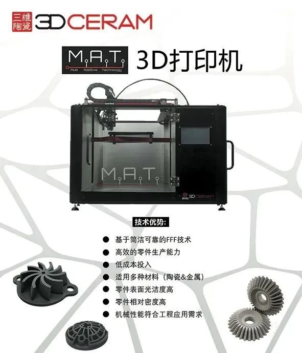 2023年8月,3DCERAM推出了新型多材料增减材技术一体设备M.A.T。这款设备可以3D打印金属、陶瓷、复合材料,而且还能实现CNC加工。它外观简约,功能多样,操作便捷,既丰富了3DCERAM的3D打印设备产品线,也为市场提供了新的选择。