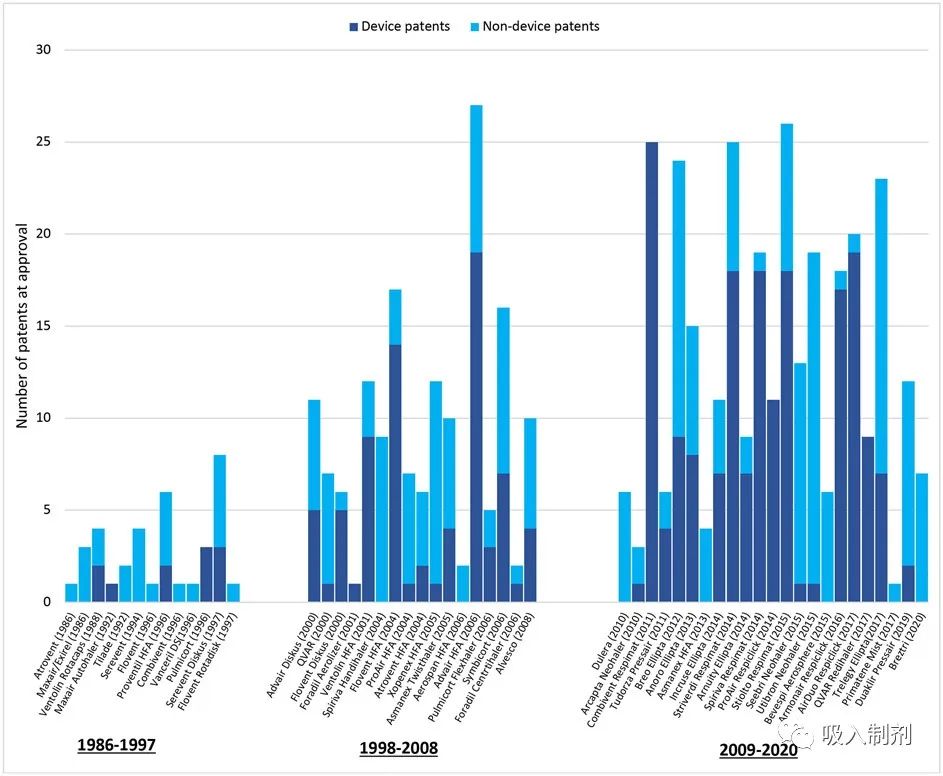 我们使用每年的 FDA 批准药物产品治疗等效性评价(桔皮书)和 Drugs@FDA中的产品标签来确定 1986-2020 年间批准的治疗哮喘和慢性阻塞性肺病的吸入制剂产品。我们从 1986 年批准的产品入手,因为从那一年开始,《桔皮书》每年都有连续的版本。这意味着排除了当时已经上市的吸入制剂,如早期的沙丁胺醇产品(这些吸入制剂的完整清单见附录附图 A1)。