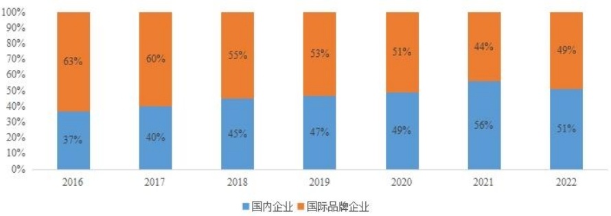 2016年-2022年全国前100强涂料企业营业收入国内企业与国际品牌企业占比情况