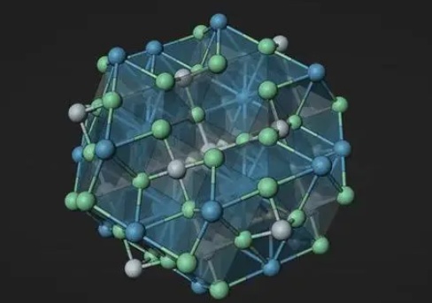 这种化合物(Ba6Nb7O21)是GNoME计算出的新材料之一,它包含钡(蓝色)、铌(白色)和氧(绿色)。