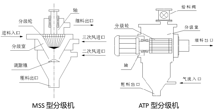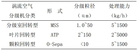 总体来说,目前工业上应用的主要涡流空气分级机是MS型、MSS型、O-Sepa型、ATP型或改进型以及LHB型、NEA型、TFS型等干式精细分级机。这些干式精细分级机可与超细粉碎机配套使用,其分级粒径可以在较大的范围内进行调节,其中TSP型、MS型及其类似的分级机的分级产品细度可达d97=10μm左右,MSS型和ATP型、NEA型、LHB型及其类似的分级机的分级产品细度可达d97=3~5μm,TTC型和TFS型分级机的产品细度可达d97=2μm。依分级机规格或尺寸的不同,单机处理能力从每小时几十千克到30t/h左右不等。