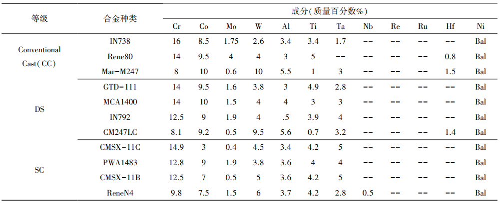 重型燃气轮机涡轮叶片用镍基高温合金的主要成分