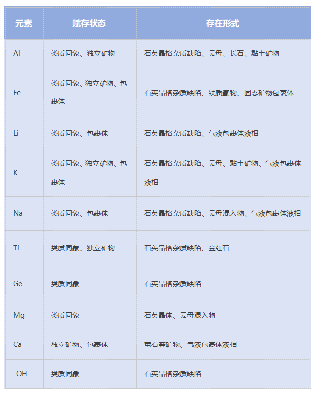 石英晶体在形成过程中,一些元素会替代硅元素进入石英晶体中,形成了石英的结构性杂质。这些杂质含量虽然很低,但从石英中分离难度大,是制约高纯石英质量最关键性因素。