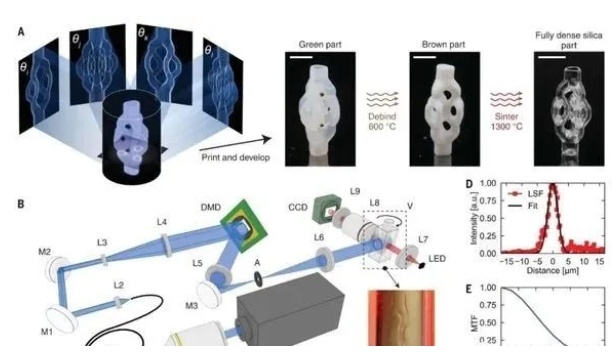 中国粉体网讯 此前,《Science》曾以封面文章发表采用轴向光刻3D打印石英玻璃的研究。源于从微光学器件到用于化学合成和生物分析的微流体系统对玻璃的尺寸、几何形状、表面粗糙度和机械强度要求的发展,传统的加工方法受到挑战。来自美国加州大学伯克利分校、劳伦斯利弗莫尔国家实验室以及德国弗莱堡大学的研究人员,研究了石英玻璃的微尺度计算轴向光刻3D打印技术,也即通常被称之为的体积3D打印。