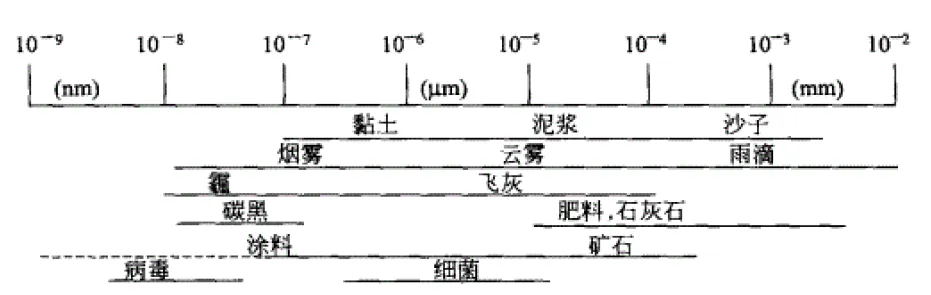 颗粒的粒度定义为颗粒所占据空间大小的尺度。其范围跨度非常广,可以从零点几纳米到几千微米。图1给出了各种颗粒物质的粒度范围。
