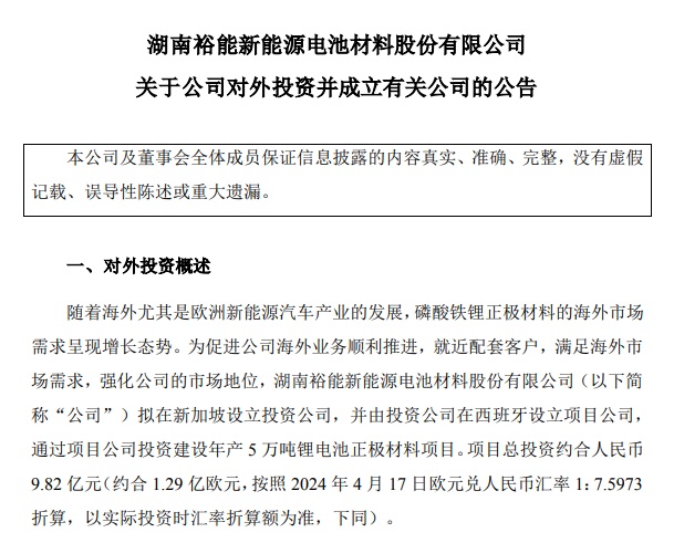 4月20日,湖南裕能发布公告称,随着海外尤其是欧洲新能源汽车产业的发展,磷酸铁锂正极材料的海外市场需求呈现增长态势。为促进公司海外业务顺利推进,就近配套客户,满足海外市场需求,强化公司的市场地位,公司拟在新加坡设立投资公司,并由投资公司在西班牙设立项目公司,通过项目公司投资建设年产5万吨锂电池正极材料项目。