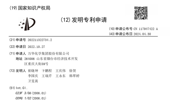 中国粉体网讯 据国家知识产权局公告,万华化学集团股份有限公司(以上简称:万华化学)申请一项名为“一种长时间高速率的钨化学机械抛光液及其应用“,公开号CN117947422A。