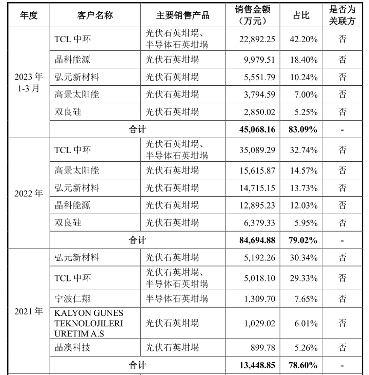 2021年,2020年,2023年1-3月,美晶新材来自前五大客户的销售收入占主营业务收入的比重分别为78.60%、79.02%和82.24%,存在客户集中度较高的风险。2022年、2023年,TCL中环都是公司第一大客户,2021年为第二大客户,若公司的主要客户经营状况、市场竞争地位出现重大不利变化,将会影响主要客户对公司的采购需求,对公司的销售收入产生不利影响。