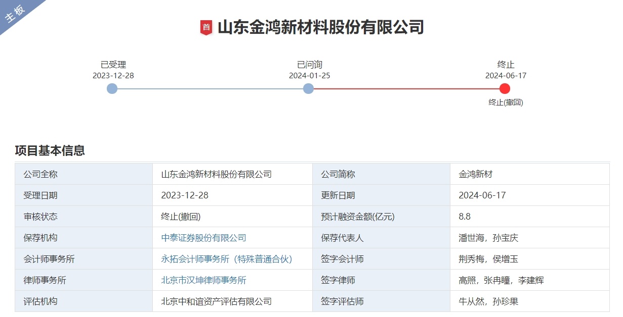 中国粉体网讯 近日,山东金鸿新材料股份有限公司(以下简称“金鸿新材”)的深主板IPO审核状态变更为“终止”,原因系该公司及其保荐人中泰证券股份有限公司撤回发行上市申请。