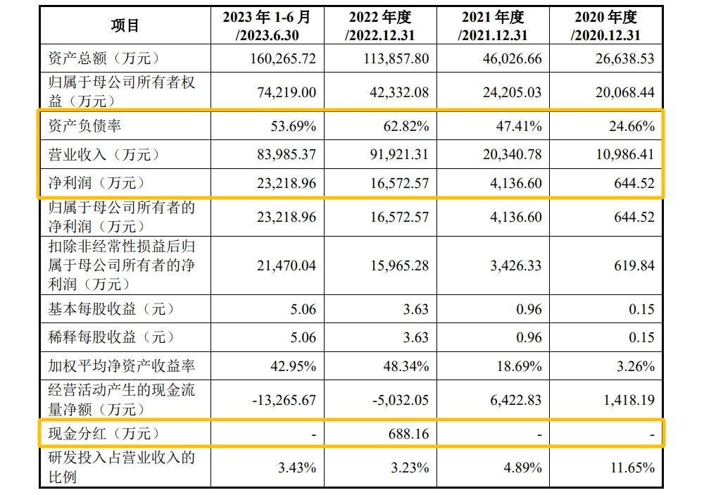 值得注意的是,公司经营活动产生的现金流量净额分别为1,418.19万元、6,422.83万元、-5,032.05万元和-13,265.67万元。2022年、2023年1-6月公司经营活动产生的现金流量净额为负,资金需求增加,发行人解释,主要原因为报告期内公司经营规模快速上升,导致运营资金需求规模快速增加。