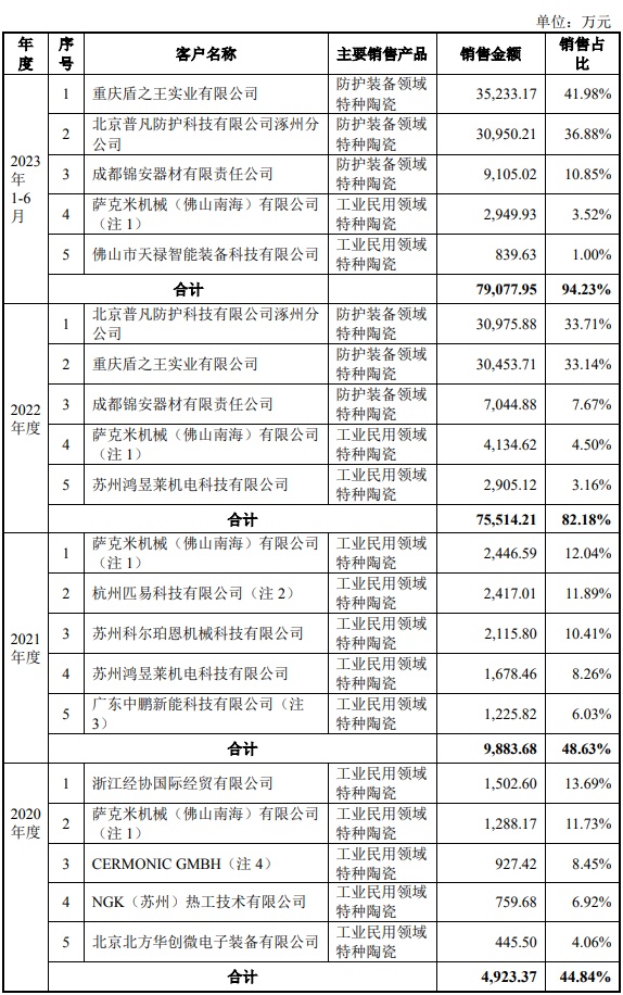 2022年度和2023年1-6月,公司获取北京普凡、成都锦安、重庆盾之王等客户碳化硼陶瓷板大额订单,导致客户集中度相对较高,这三家大客户还间接导致公司的主营产品赛道发生变化。