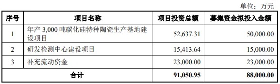 本次申请上市,公司原计划募集资金8.8亿元,用于年产3000吨碳化硅特种陶瓷生产基地建设项目、研发检测中心建设项目、补充流动资金。